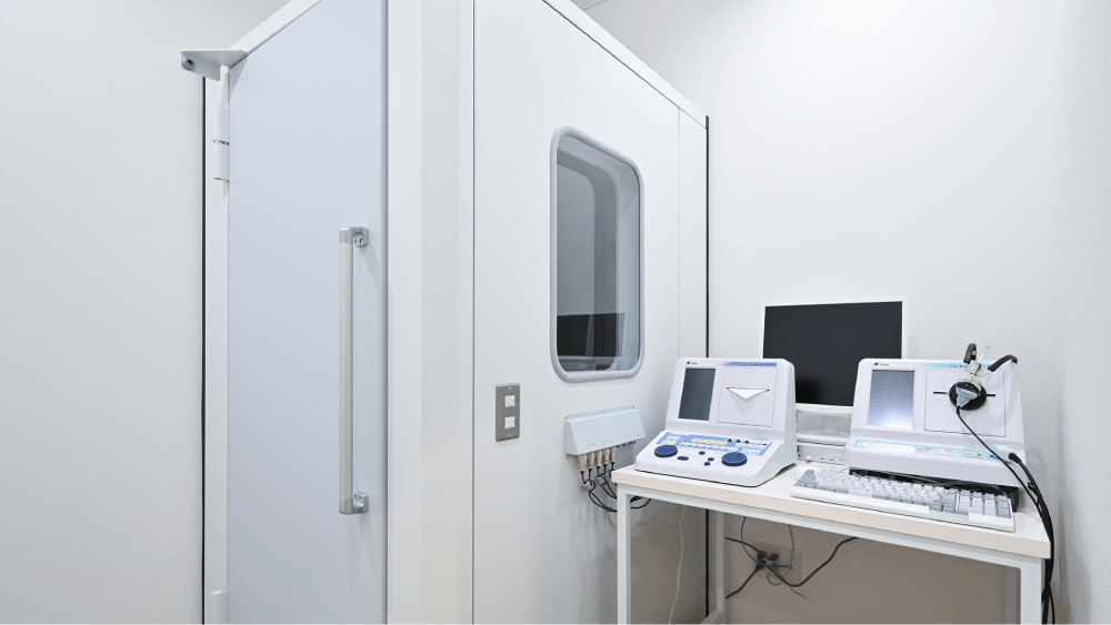 周囲の音を遮断した防音室内で、聞こえの検査(純音聴力検査・ティンパノメトリー)を行います。