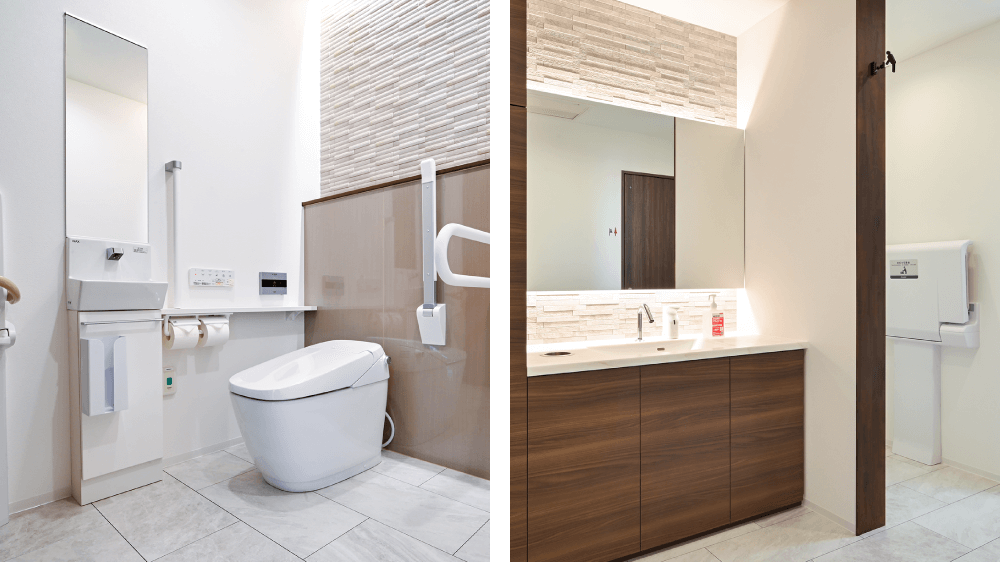広々したトイレは車椅子の方でも安心して利用いただけます。女性専門トイレもあり、プライバシーも安心です。また、オムツ替えスペースもご用意しており、小さなお子様連れの方も安心です。