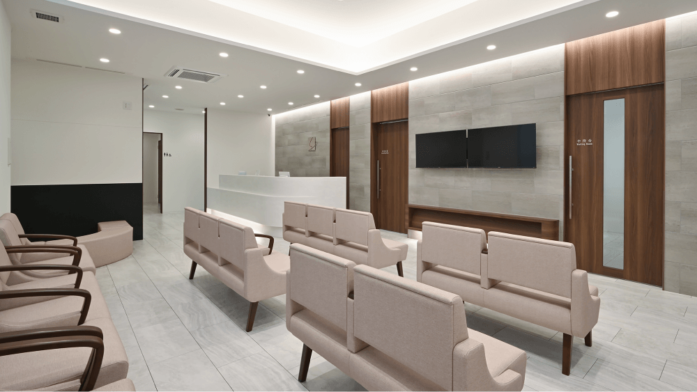 広々とした待合スペースは、大きな窓から光が差し込み明るい空間です。バリアフリー完備なので、ベビーカーや車椅子の方でも安心です。